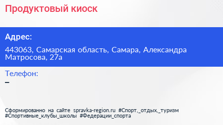 Продуктовый киоск по адресу 443063, Самарская область, Самара, Александра Матросова, 27а в дальнейшем Организация, размещена в следующих категориях: