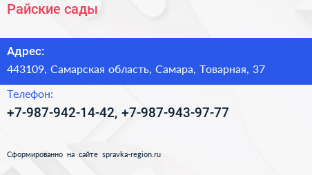Райские сады по адресу 443109, Самарская область, Самара, Товарная, 37 в дальнейшем Организация, размещена в следующих категориях: