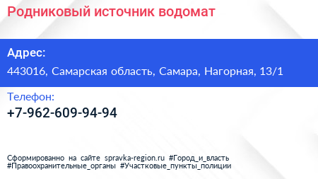 Родниковый источник, водомат по адресу 443016, Самарская область, Самара, Нагорная, 13/1 в дальнейшем Организация, размещена в следующих категориях: