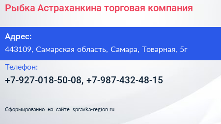 Рыбка Астраханкина, торговая компания по адресу 443109, Самарская область, Самара, Товарная, 5г в дальнейшем Организация, размещена в следующих категориях: