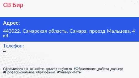 СВ Бир по адресу 443022, Самарская область, Самара, проезд Мальцева, 4 к4 в дальнейшем Организация, размещена в следующих категориях: