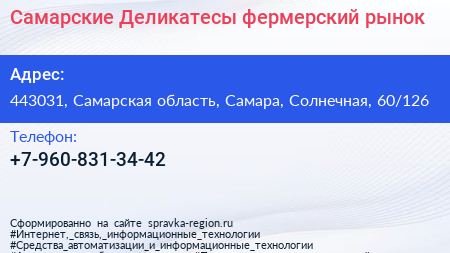 Самарские Деликатесы, фермерский рынок по адресу 443031, Самарская область, Самара, Солнечная, 60/126 в дальнейшем Организация, размещена в следующих категориях: