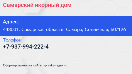 Самарский икорный дом по адресу 443031, Самарская область, Самара, Солнечная, 60/126 в дальнейшем Организация, размещена в следующих категориях: