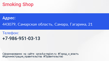 Smoking Shop по адресу 443079, Самарская область, Самара, Гагарина, 21 в дальнейшем Организация, размещена в следующих категориях: