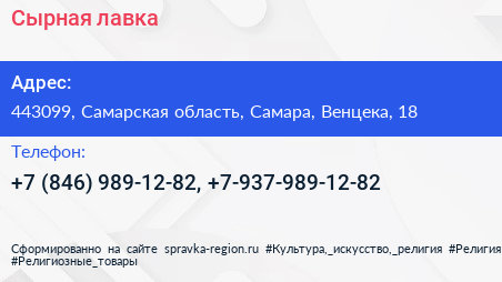 Сырная лавка по адресу 443099, Самарская область, Самара, Венцека, 18 в дальнейшем Организация, размещена в следующих категориях: