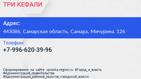 ТРИ КЕФАЛИ по адресу 443086, Самарская область, Самара, Мичурина, 126 в дальнейшем Организация, размещена в следующих категориях:
