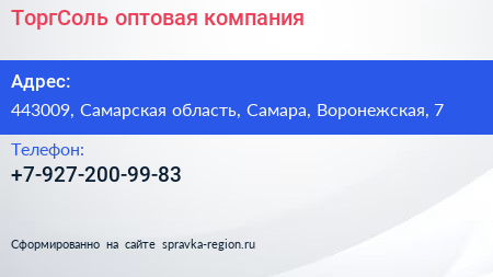 ТоргСоль, оптовая компания по адресу 443009, Самарская область, Самара, Воронежская, 7 в дальнейшем Организация, размещена в следующих категориях: