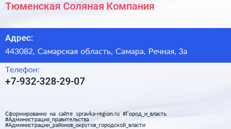 Тюменская Соляная Компания по адресу 443082, Самарская область, Самара, Речная, 3а в дальнейшем Организация, размещена в следующих категориях: