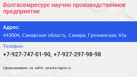 Волгасемресурс, научно-производственное предприятие по адресу 443004, Самарская область, Самара, Грозненская, 65а в дальнейшем Организация, размещена в следующих категориях: