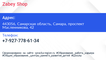 Zabey Shop по адресу 443056, Самарская область, Самара, проспект Масленникова, 42 в дальнейшем Организация, размещена в следующих категориях: