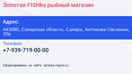 Золотая FISHka, рыбный магазин по адресу 443080, Самарская область, Самара, Антонова-Овсеенко, 10а в дальнейшем Организация, размещена в следующих категориях:
