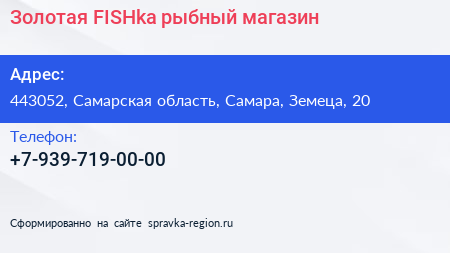 Золотая FISHka, рыбный магазин по адресу 443052, Самарская область, Самара, Земеца, 20 в дальнейшем Организация, размещена в следующих категориях: