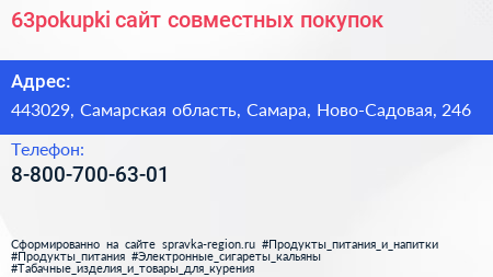 63pokupki, сайт совместных покупок по адресу 443029, Самарская область, Самара, Ново-Садовая, 246 в дальнейшем Организация, размещена в следующих категориях: