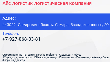 Айс-логистик, логистическая компания по адресу 443022, Самарская область, Самара, Заводское шоссе, 20 в дальнейшем Организация, размещена в следующих категориях:
