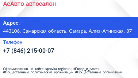 АсАвто, автосалон по адресу 443106, Самарская область, Самара, Алма-Атинская, 87 в дальнейшем Организация, размещена в следующих категориях: