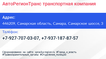 АвтоРегионТранс, транспортная компания по адресу 446209, Самарская область, Самара, Самарское шоссе, 3 в дальнейшем Организация, размещена в следующих категориях: