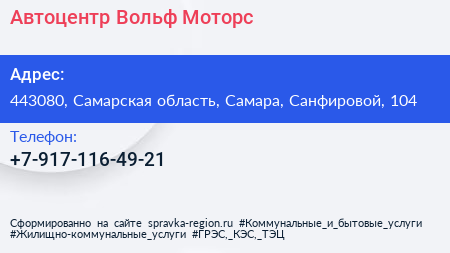 Автоцентр Вольф-Моторс по адресу 443080, Самарская область, Самара, Санфировой, 104 в дальнейшем Организация, размещена в следующих категориях: