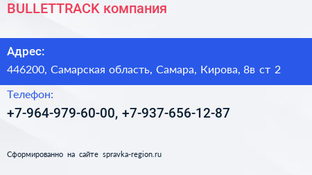 BULLETTRACK, компания по адресу 446200, Самарская область, Самара, Кирова, 8в ст 2 в дальнейшем Организация, размещена в следующих категориях: