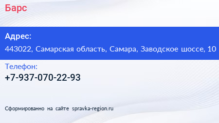 Барс по адресу 443022, Самарская область, Самара, Заводское шоссе, 10 в дальнейшем Организация, размещена в следующих категориях: