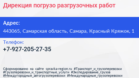 Дирекция погрузо-разгрузочных работ по адресу 443065, Самарская область, Самара, Красный Кряжок, 1 в дальнейшем Организация, размещена в следующих категориях: