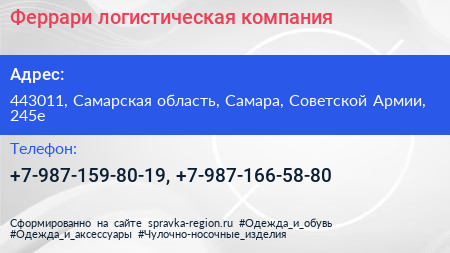 Феррари, логистическая компания по адресу 443011, Самарская область, Самара, Советской Армии, 245е в дальнейшем Организация, размещена в следующих категориях: