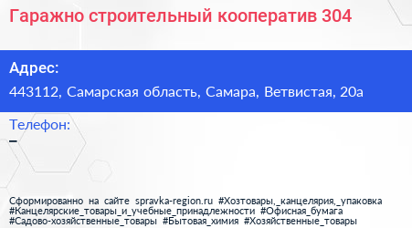 Гаражно-строительный кооператив №304 по адресу 443112, Самарская область, Самара, Ветвистая, 20а в дальнейшем Организация, размещена в следующих категориях: