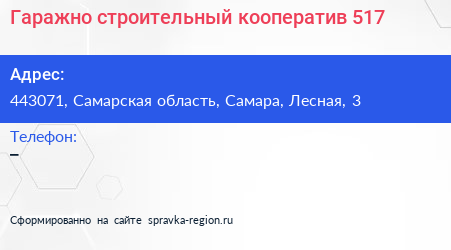 Гаражно-строительный кооператив №517 по адресу 443071, Самарская область, Самара, Лесная, 3 в дальнейшем Организация, размещена в следующих категориях: