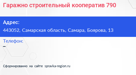 Гаражно-строительный кооператив №790 по адресу 443052, Самарская область, Самара, Боярова, 13 в дальнейшем Организация, размещена в следующих категориях: