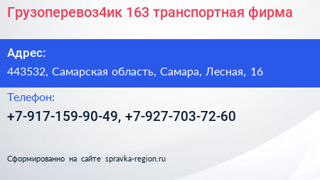 Грузоперевоз4ик 163, транспортная фирма по адресу 443532, Самарская область, Самара, Лесная, 16 в дальнейшем Организация, размещена в следующих категориях: