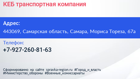 КЕБ, транспортная компания по адресу 443069, Самарская область, Самара, Мориса Тореза, 67а в дальнейшем Организация, размещена в следующих категориях: