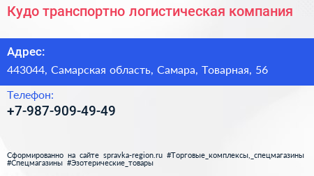 Кудо, транспортно-логистическая компания по адресу 443044, Самарская область, Самара, Товарная, 56 в дальнейшем Организация, размещена в следующих категориях:
