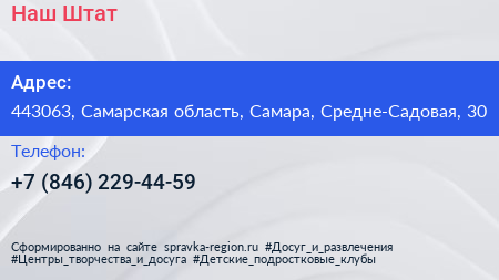 Наш Штат по адресу 443063, Самарская область, Самара, Средне-Садовая, 30 в дальнейшем Организация, размещена в следующих категориях: