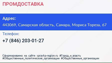 ПРОМДОСТАВКА по адресу 443069, Самарская область, Самара, Мориса Тореза, 67 в дальнейшем Организация, размещена в следующих категориях: