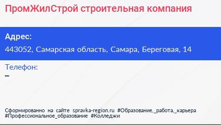 ПромЖилСтрой, строительная компания по адресу 443052, Самарская область, Самара, Береговая, 14 в дальнейшем Организация, размещена в следующих категориях:
