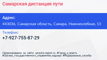 Самарская дистанция пути по адресу 443036, Самарская область, Самара, Нижнехлебная, 13 в дальнейшем Организация, размещена в следующих категориях:
