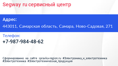 Segway.ru, сервисный центр по адресу 443011, Самарская область, Самара, Ново-Садовая, 271 в дальнейшем Организация, размещена в следующих категориях: