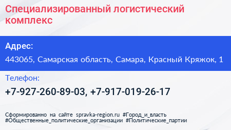 Специализированный логистический комплекс по адресу 443065, Самарская область, Самара, Красный Кряжок, 1 в дальнейшем Организация, размещена в следующих категориях: