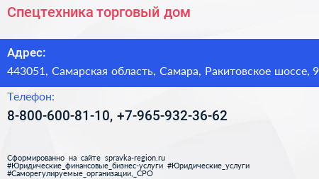 Спецтехника, торговый дом по адресу 443051, Самарская область, Самара, Ракитовское шоссе, 9 в дальнейшем Организация, размещена в следующих категориях: