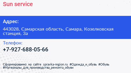 Sun service по адресу 443028, Самарская область, Самара, Козелковская станция, 3а в дальнейшем Организация, размещена в следующих категориях: