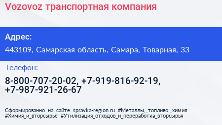 Vozovoz, транспортная компания по адресу 443109, Самарская область, Самара, Товарная, 33 в дальнейшем Организация, размещена в следующих категориях: