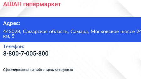 АШАН, гипермаркет по адресу 443028, Самарская область, Самара, Московское шоссе 24 км, 5 в дальнейшем Организация, размещена в следующих категориях: