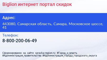 Biglion, интернет-портал скидок по адресу 443080, Самарская область, Самара, Московское шоссе, 41 в дальнейшем Организация, размещена в следующих категориях: