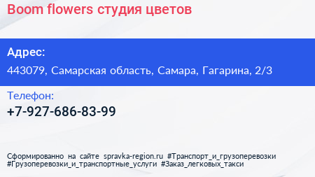 Boom flowers, студия цветов по адресу 443079, Самарская область, Самара, Гагарина, 2/3 в дальнейшем Организация, размещена в следующих категориях: