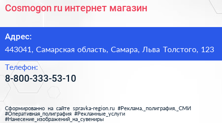 Cosmogon.ru, интернет-магазин по адресу 443041, Самарская область, Самара, Льва Толстого, 123 в дальнейшем Организация, размещена в следующих категориях: