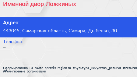 Именной двор Ложкиных по адресу 443045, Самарская область, Самара, Дыбенко, 30 в дальнейшем Организация, размещена в следующих категориях: