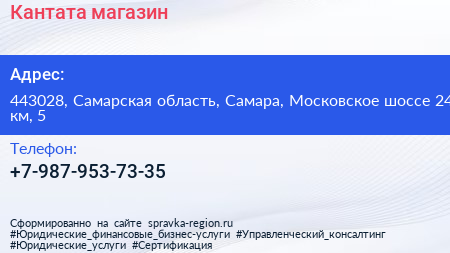 Кантата, магазин по адресу 443028, Самарская область, Самара, Московское шоссе 24 км, 5 в дальнейшем Организация, размещена в следующих категориях: