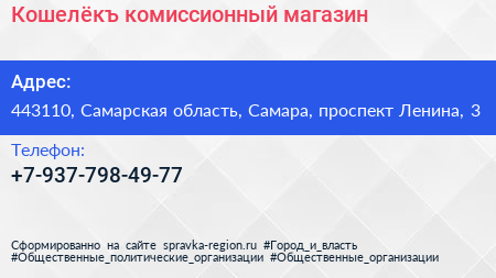 Кошелёкъ, комиссионный магазин по адресу 443110, Самарская область, Самара, проспект Ленина, 3 в дальнейшем Организация, размещена в следующих категориях: