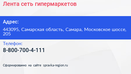Лента, сеть гипермаркетов по адресу 443095, Самарская область, Самара, Московское шоссе, 205 в дальнейшем Организация, размещена в следующих категориях: