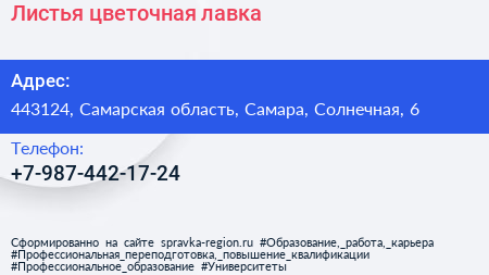 Листья, цветочная лавка по адресу 443124, Самарская область, Самара, Солнечная, 6 в дальнейшем Организация, размещена в следующих категориях: