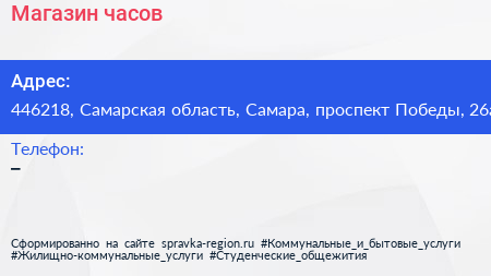 Магазин часов по адресу 446218, Самарская область, Самара, проспект Победы, 26а в дальнейшем Организация, размещена в следующих категориях: